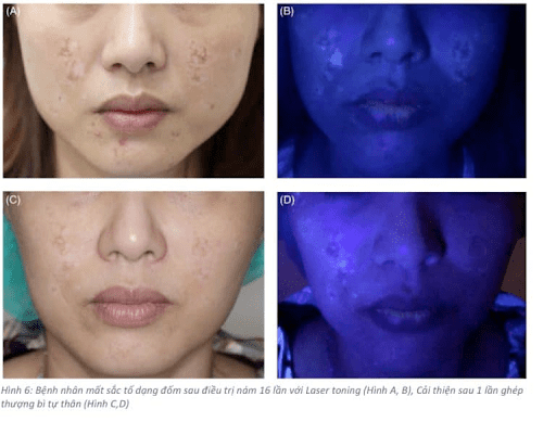 Wattanakrai và cộng sự thu nhận 22 bệnh nhân bị nám và thực hiện laser toning và HQ 2% cho một bên mặt và chỉ HQ 2% cho bên còn lại [10]. Kết quả cho thấy vùng mặt được điều trị bằng laser toning kết hợp với HQ có sự cải thiện cao hơn (p <0,001), nhưng 3 người có giảm sắc tố dạng đốm phát triển và 4 người bị tăng sắc tố ngược. Sau 12 tuần, tất cả 22 bệnh nhân đều tái phát nám.