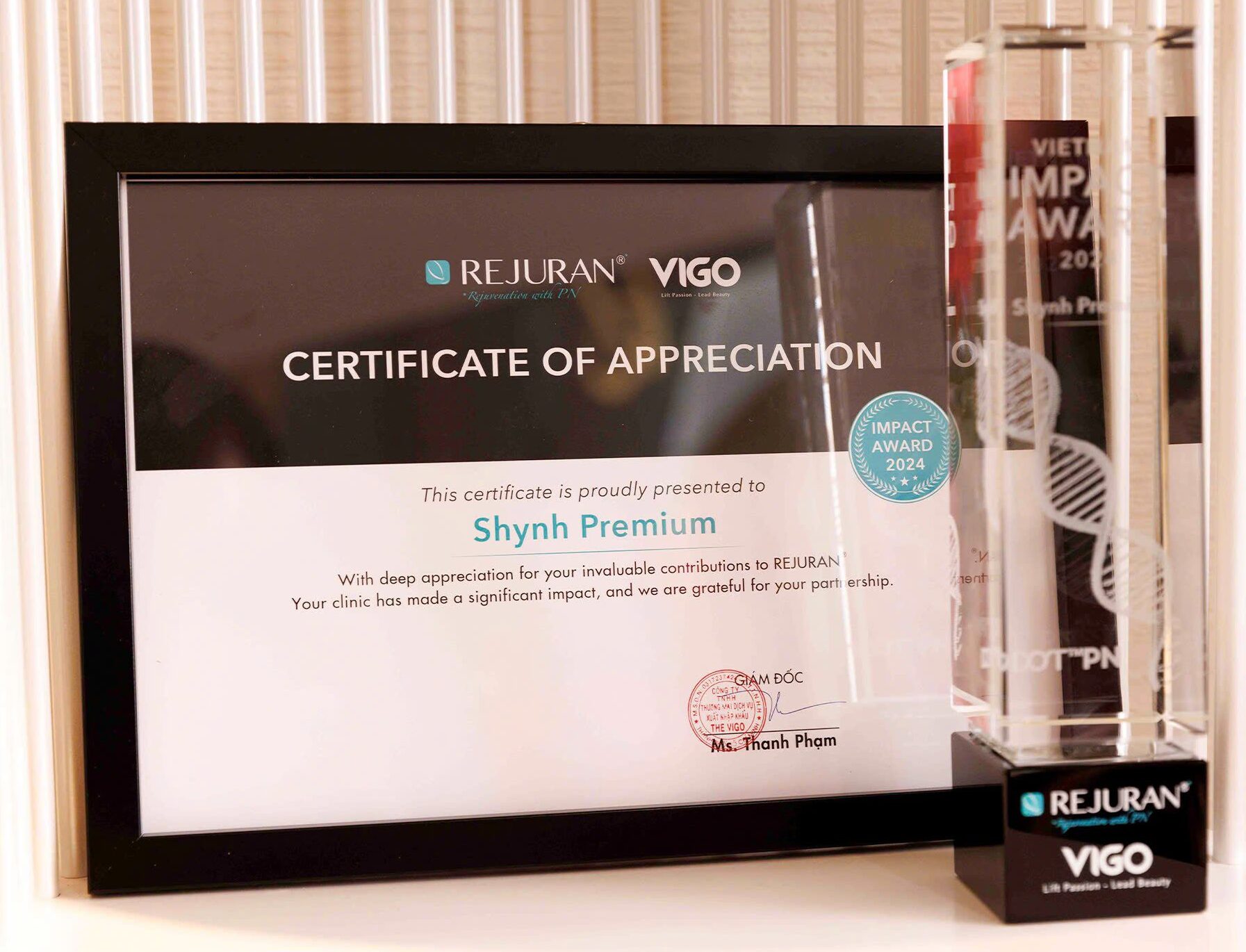 Ngày 02/01/2024, Rejuran® Vietnam tổ chức chuỗi hoạt động trao giải thưởng Rejuran® Vietnam Impact Award 2024, ghi nhận những đóng góp nổi bật của các đơn vị thẩm mỹ uy tín. Trong số các đối tác chiến lược được vinh danh, Shynh Premium đã xuất sắc nhận giải thưởng này nhờ vai trò tiên phong trong việc ứng dụng công nghệ tái tạo sinh học và phát triển các giải pháp làm đẹp bền vững tại Việt Nam.