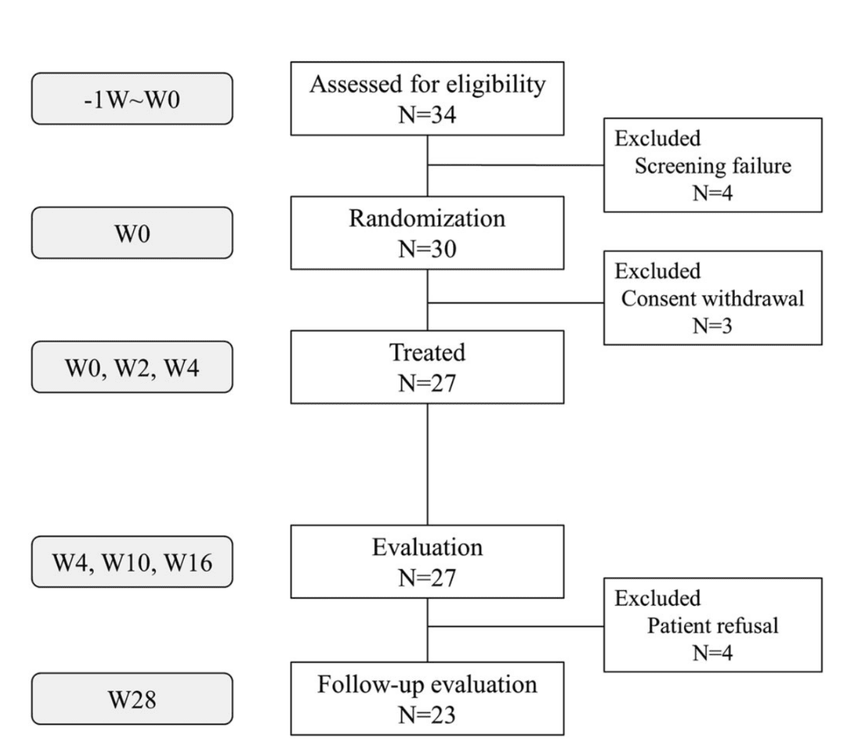 Trong số 34 đối tượng được sàng lọc, 30 đối tượng đã được phân bổ ngẫu nhiên và 27 đối tượng đã được điều trị. 27 đối tượng được điều trị đã được đánh giá tại W4, W10 và W16, và 23 đối tượng đã được đánh giá tại W28 (Hình 1).