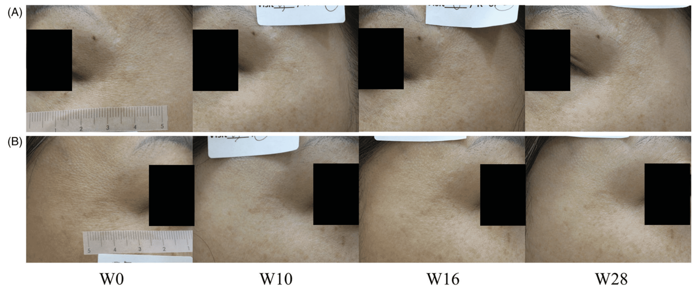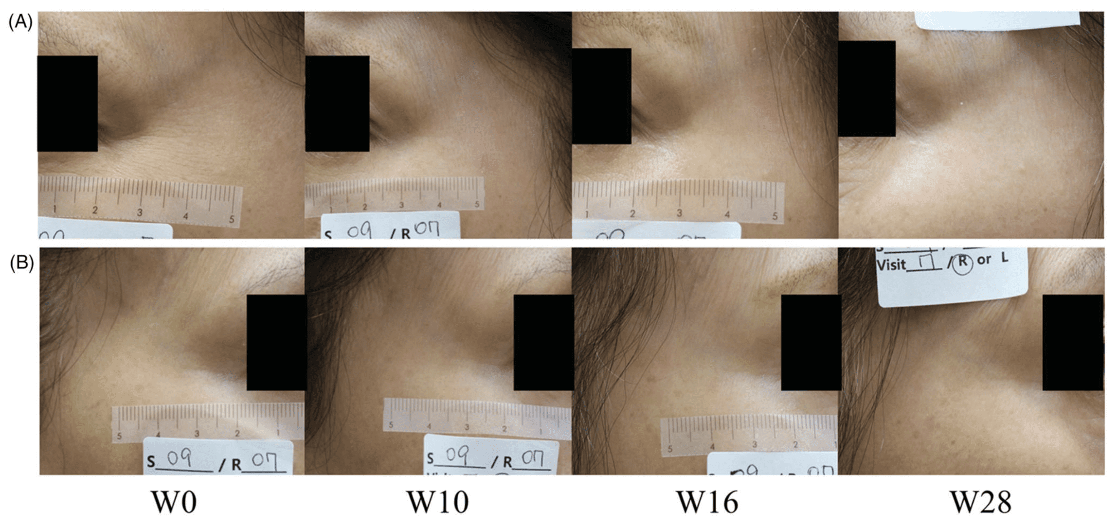 Sự thay đổi trong tỷ lệ cải thiện độ sần da theo thời gian ở nhóm PN cao hơn nhóm HA (p=.0247). Tỷ lệ cải thiện độ sần ở nhóm PN tăng theo thời gian, trong khi ở nhóm HA lại giảm. Tỷ lệ cải thiện độ sần ở nhóm PN cao hơn ở nhóm HA tại W28 (p=.0206, Ảnh 7(A)).