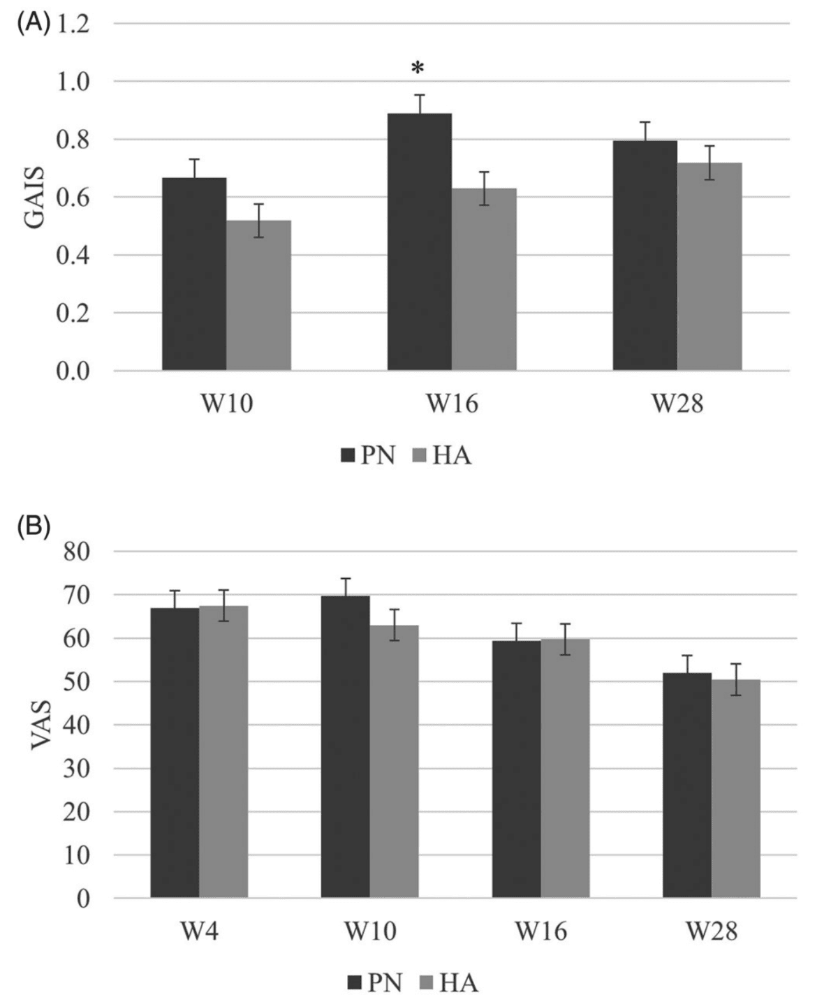 Tất cả các đối tượng đều là phụ nữ với độ tuổi trung bình là 48,78 năm (dao động: 37–62 năm). Tám đối tượng ở độ tuổi 35–44, 10 người ở độ tuổi 45–54 và chín người ở độ tuổi 55–64. Điểm GAIS cao hơn ở nhóm PN so với nhóm HA ở mức ¼ .0398). Ngược lại, điểm VAS không cho thấy sự khác biệt đáng kể giữa các nhóm; nó giảm dần theo thời gian (Hình 2–4).