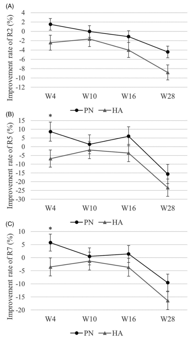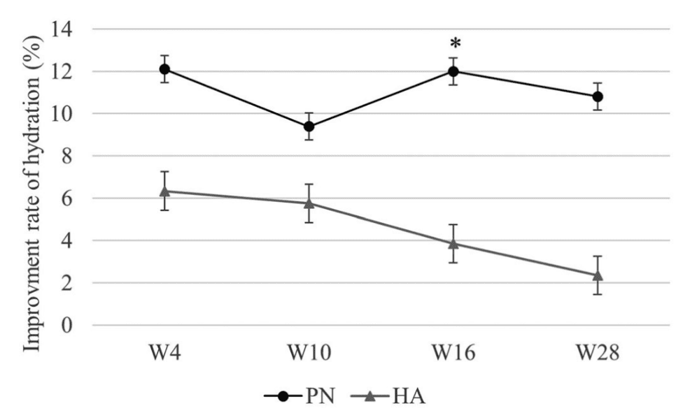 Mặc dù sự thay đổi trong tỷ lệ cải thiện hydrat hóa theo thời gian không cho thấy bất kỳ sự khác biệt đáng kể nào giữa nhóm PN và HA (p = .8281), tỷ lệ cải thiện của hydrat hóa trong nhóm PN cao hơn so với HA (p = .0043; Hình 6). Tỷ lệ cải thiện hydrat hóa trong nhóm PN cao hơn nhóm HA ở W16 (p=.0486).