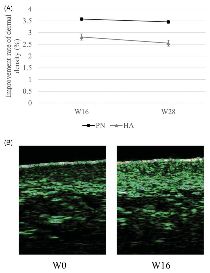 Hình: Hình 8. (A) Tỷ lệ cải thiện mật độ da ở các nhóm Polynucleotide (PN) và Hyaluronic acid (HA). (B) Sự gia tăng mật độ da ở một phụ nữ 44 tuổi được điều trị bằng chất làm đầy PN, được quan sát bằng cách sử dụng máy quét da, từ thời điểm ban đầu và sau 16 tuần.